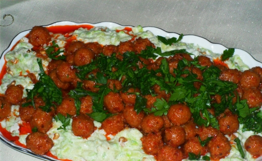 Bulgur ve irmik sıcak su ile ıslatılarak bulgur şişene kadar bekletilir. Un, salça, tuz ve baharatlar eklenerek yoğrulur. Kıvam vermek için azar azar su eklenebilir. Hamurdan küçük parçalar koparılarak yuvarlanır. Yapılan bulgur köfteleri unlanmış bir tepsiye konur. (Bu hamurla çıkan köftelerin yarısını kullandım. Kalabalık olmadığımız için. Sizde kişi sayısına göre ayarlayabilirsiniz) Kabaklar rendelenir. Zeytinyağında hafif diri kalacak şekilde kavrulur. Yoğurt ve sarımsak karıştırılır. Sarımsaklı yoğurt kavrulmuş kabakla karıştırılıp servis tabağına alınır. Bulgur köfteleri kaynar suda haşlanır. Sos için salça zeytinyağında kavrulur ve su eklenerek karıştırılır. Hafif suyunu çekince ocaktan alınır. Bulgur köfteleri sosla karıştırılıp yoğurtlu kabağın üstüne yayılır. Afiyet olsun.