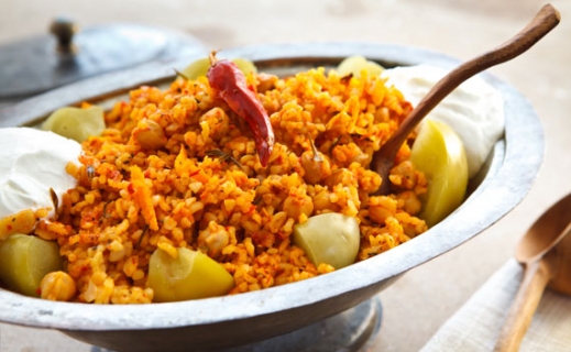 Bulguru ekleyerek 1-2 dakika kavurun ve sıcak tavuk suyunu ve sıcak suyu ekleyin. Tuzunu da ilave ederek bir kez karıştırın kapağını kapatın. Kısık ateşte suyu çekene kadar karıştırmadan pişirin. Ocağı kapattıktan sonra kapağın altına havlu kağıt koyarak 10 dakika kadar dinlendirin.